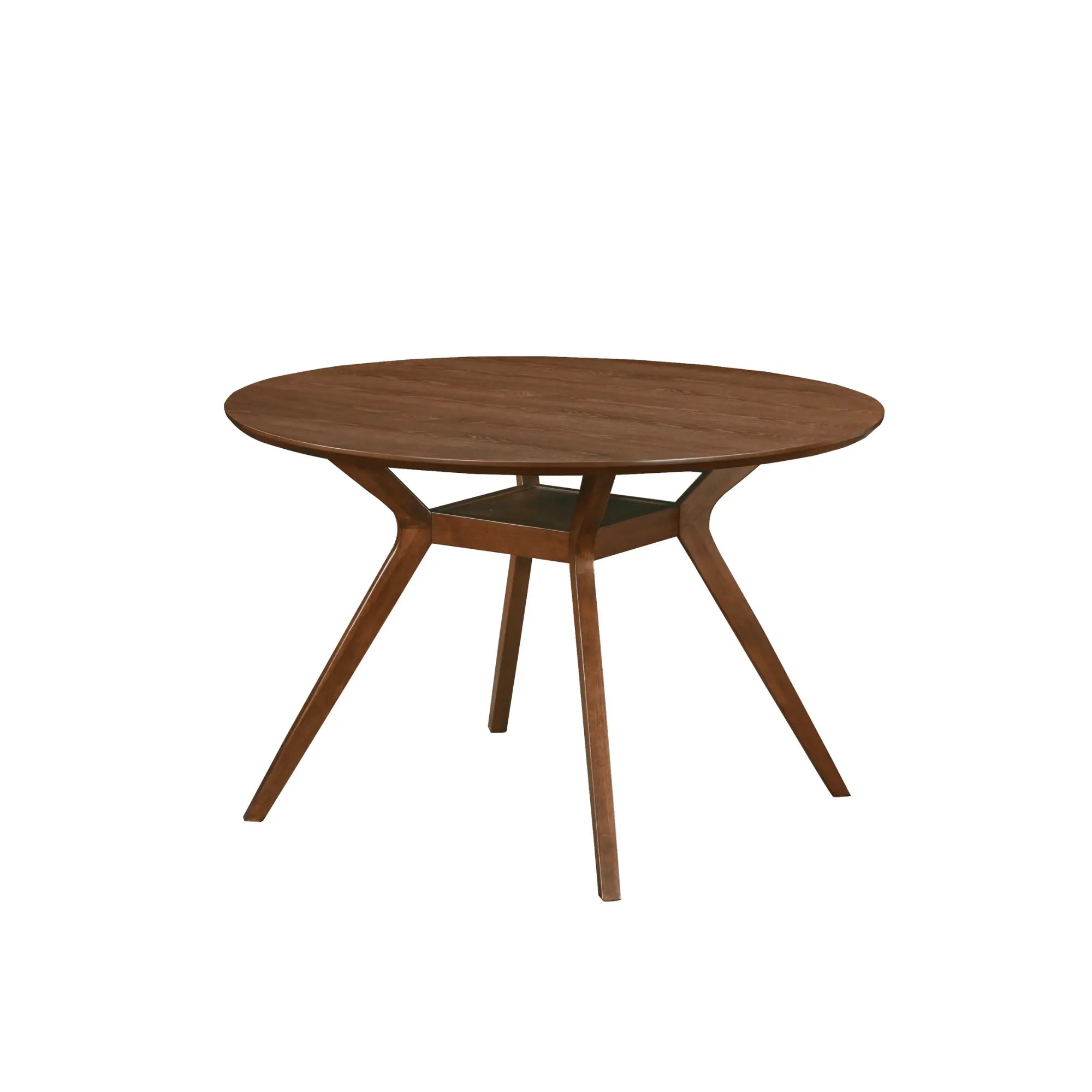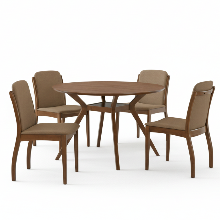 Juego de comedor con mesa redonda de cubierta en MDF enchapada en tono café y patas de madera sólida, aporta resistencia y un acabado elegante que se adapta a cualquier ambiente.