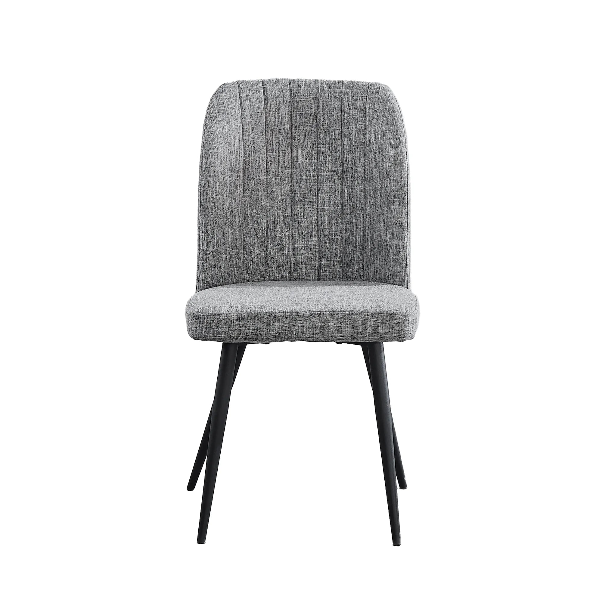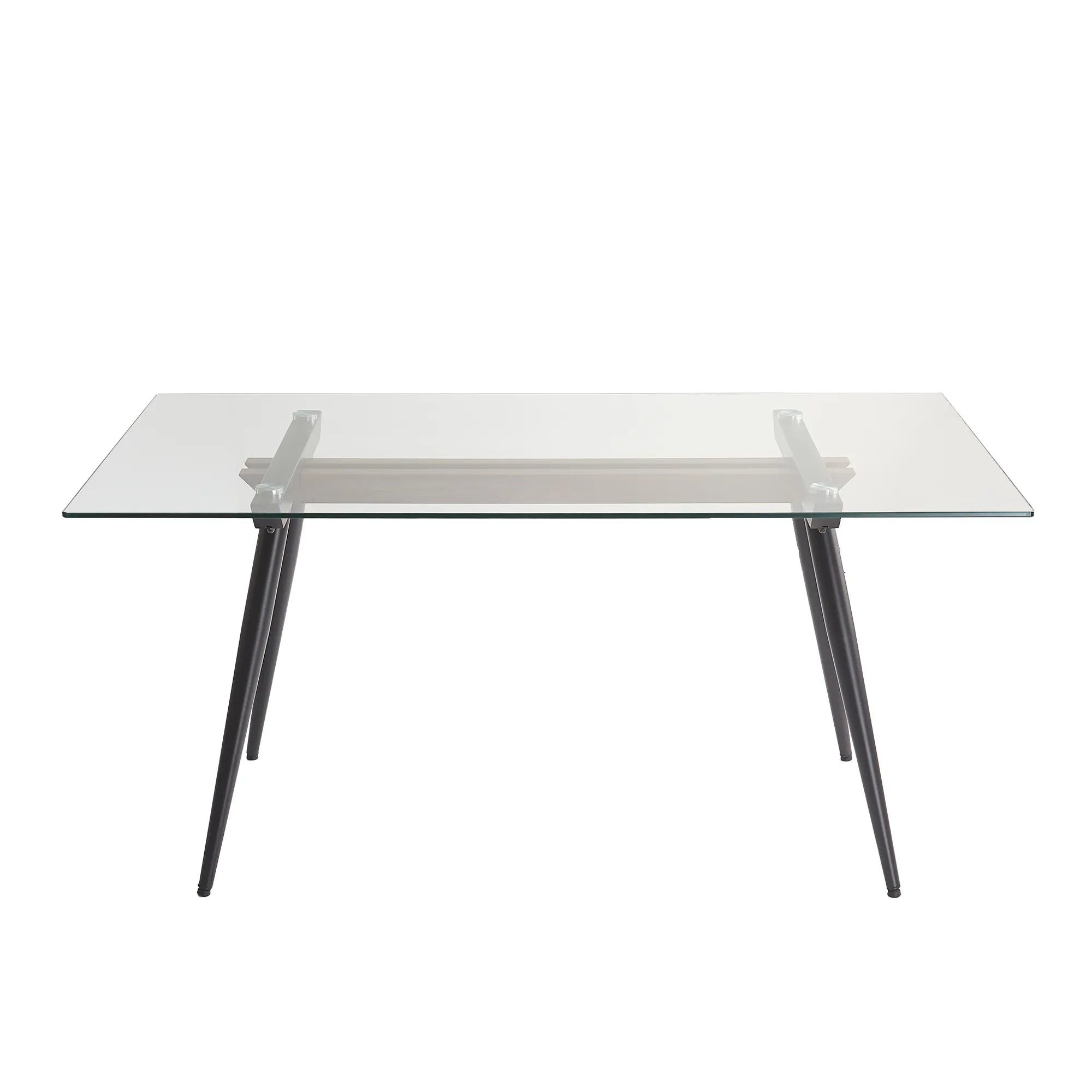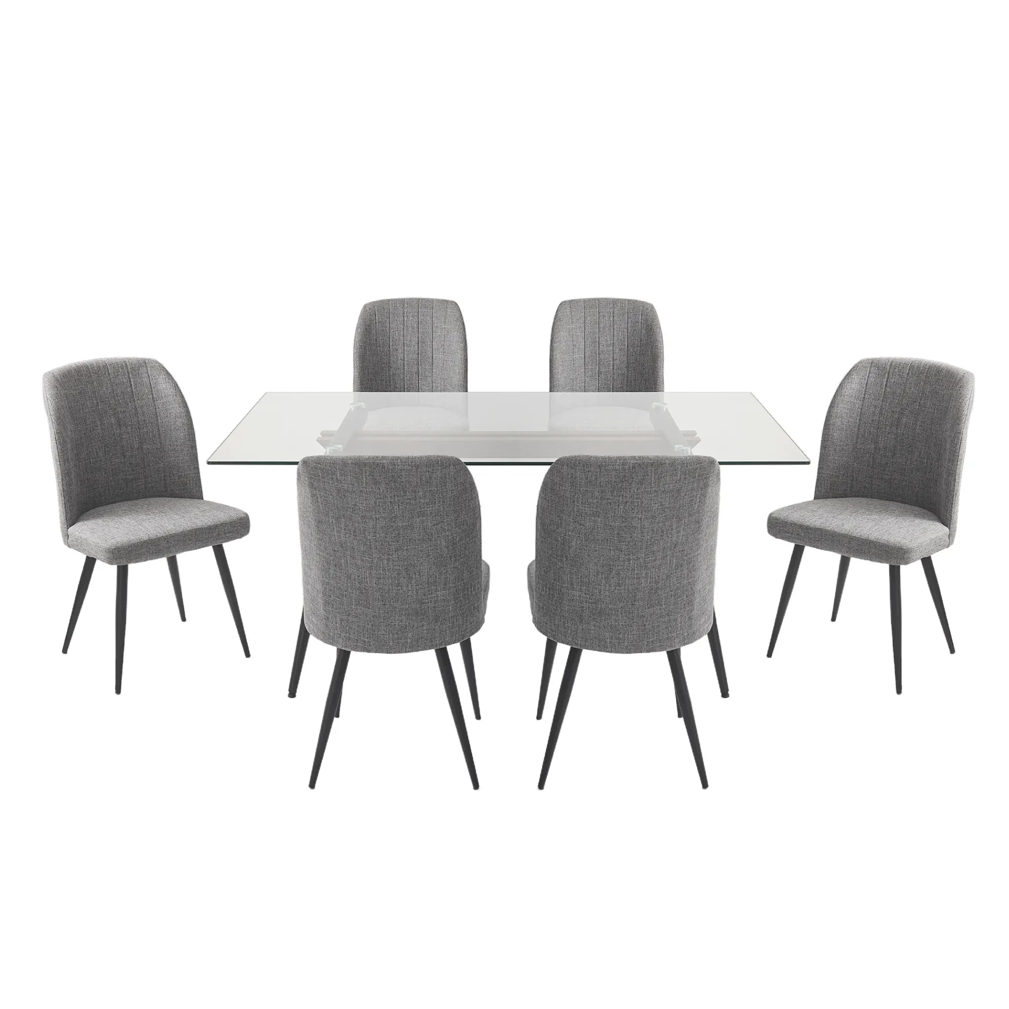 Juego de comedor de 6 sillas, su mesa con cubierta de vidrio templado aporta luminosidad y amplitud al espacio, mientras las sillas tapizadas en tela gris brindan comodidad y un look contemporáneo.