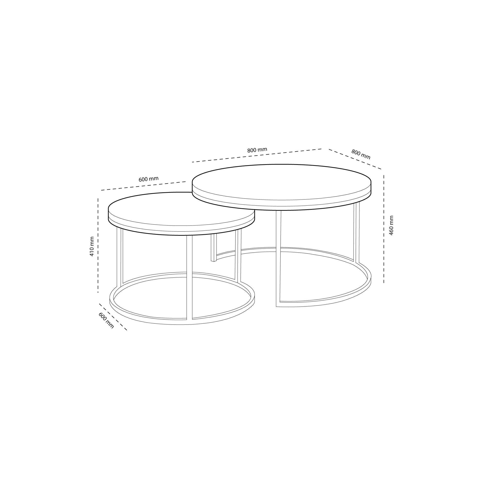 Producto armado: Mesa grande Alto 46 cm, Ancho 80 cm, Profundidad 80 cm; Mesa pequeña Alto 41 cm, Ancho 60 cm, Profundidad 60 cm; Bultos (2 cajas): 10x86x84 cm, 10x66x64 cm