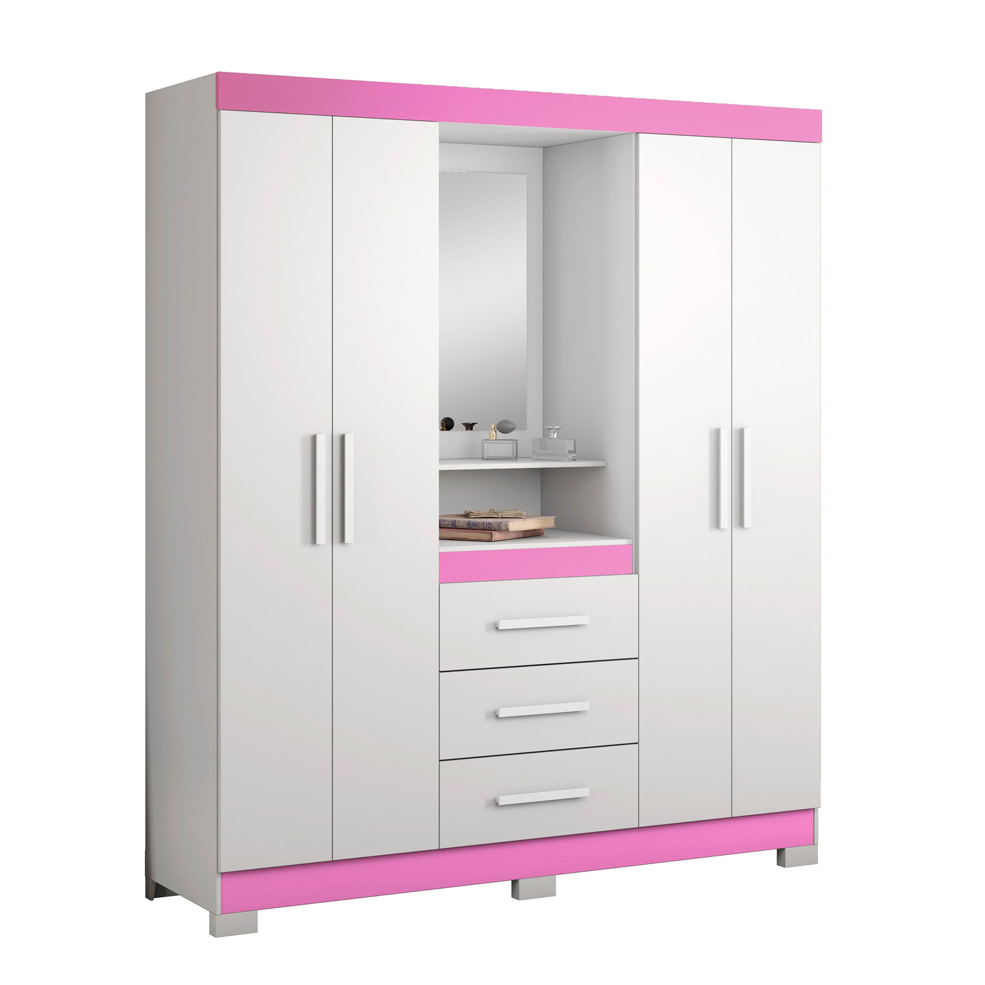Closet Capelinha cuenta con amplio espacio, y su estructura se compone de 3 cajones externos, un perchero de madera. El modelo flex permite ajustar los colores según preferencia. En el momento del armado puedes elegir si le das el toque rosado, o lo dejas de color blanco, ambos colores se adaptan a tu habitación.