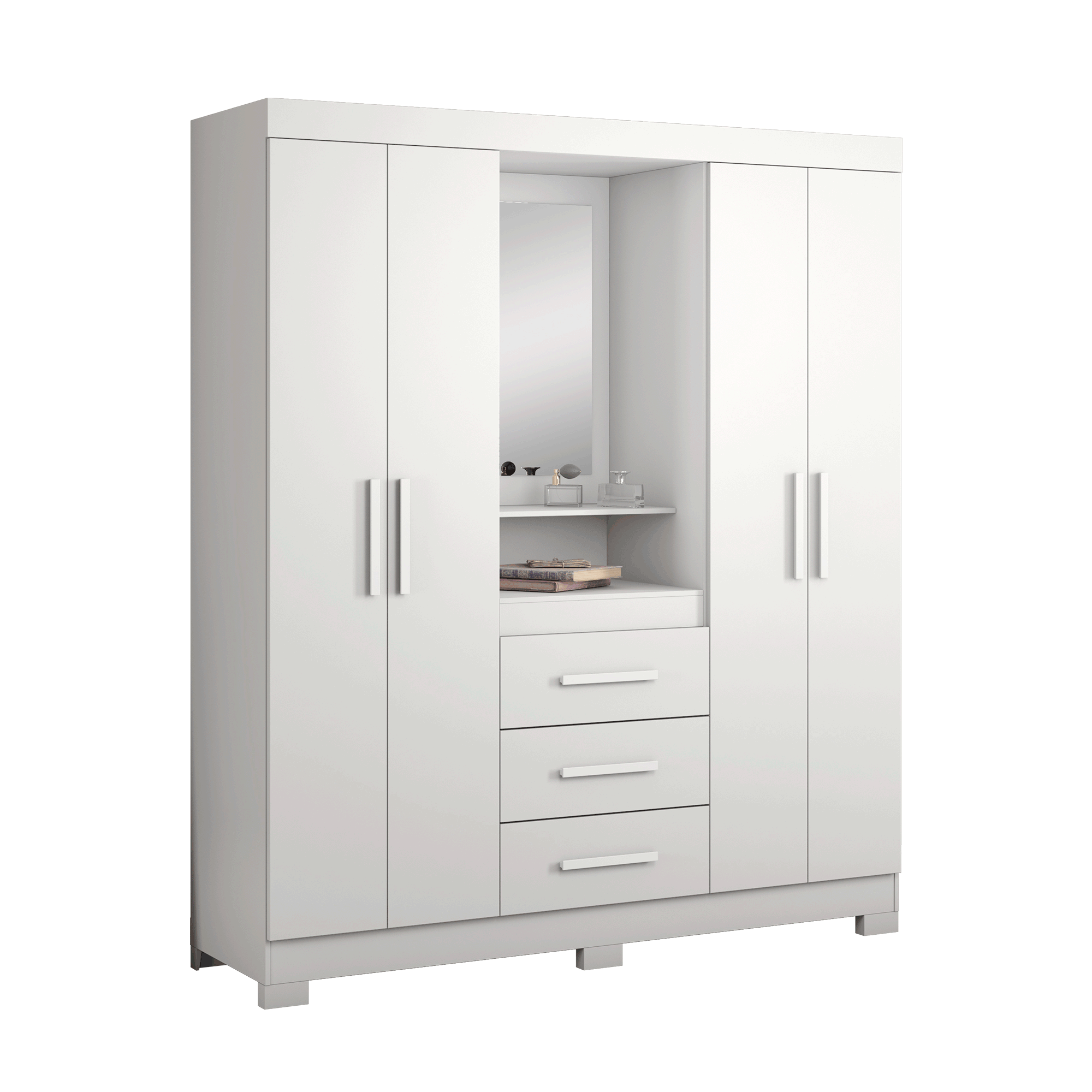 Características: cuatro puertas con bisagras metálicas, tres cajones con rieles metálicos, dos colgadores horizontales, repisas internas, manillas de materialidad MDF. Incluye espejo, incluye set de patas materialidad plásticas.