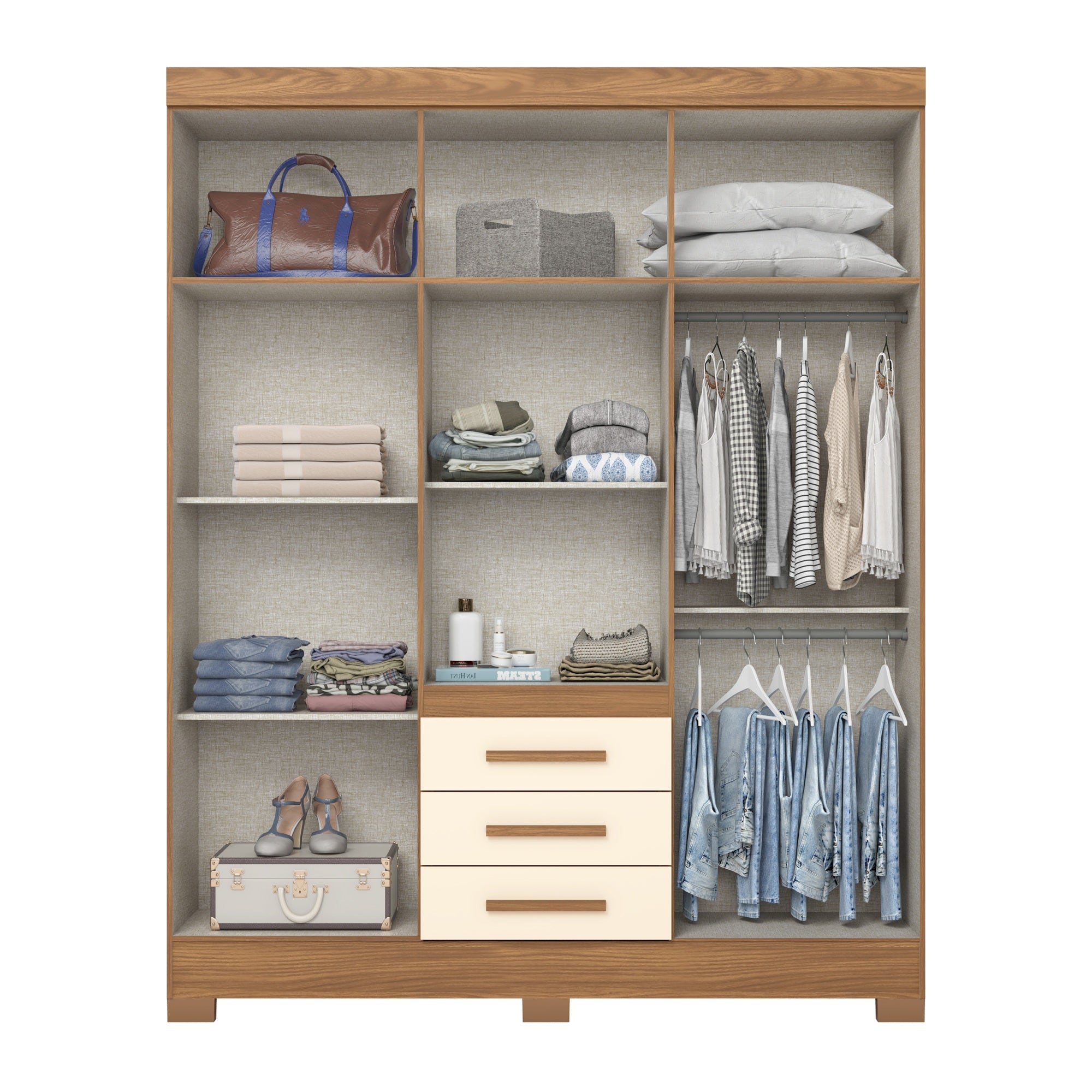Su amplia capacidad interior permite mantener tu ropa, accesorios y calzado siempre organizados, mientras el acabado ripado aporta un toque moderno y elegante al espacio.