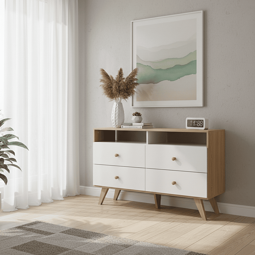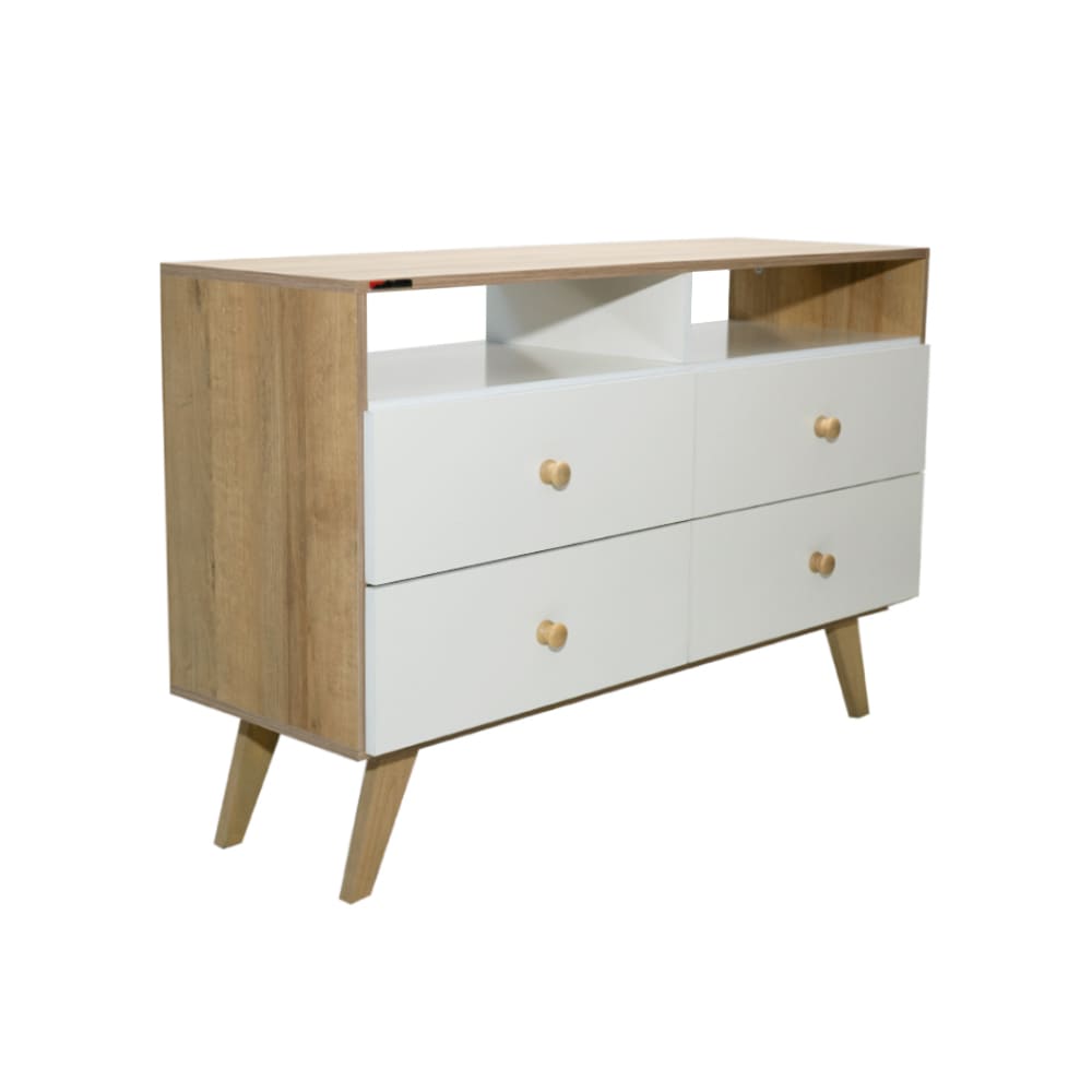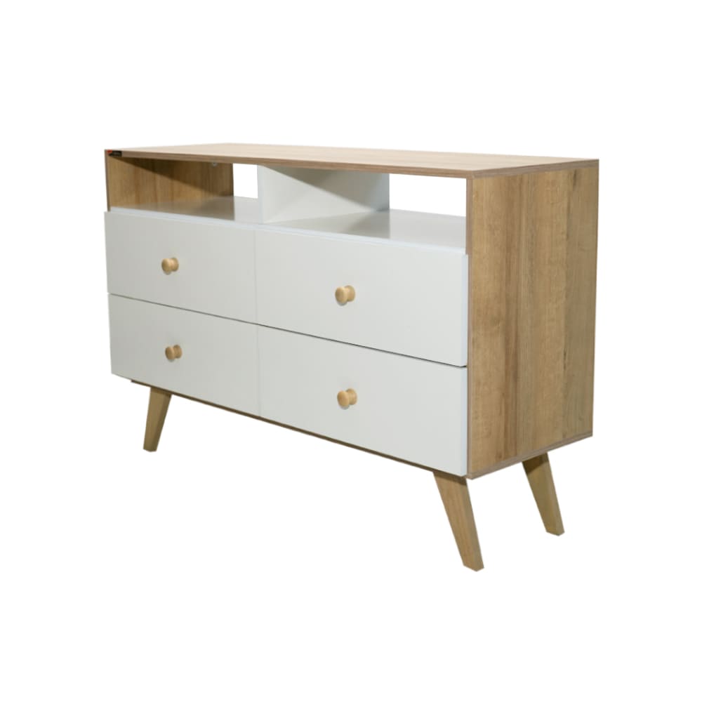 Esta cómoda combina una estructura de madera clara con cuatro cajones en blanco satinado. El diseño incluye un práctico estante superior abierto y se apoya sobre patas cónicas en ángulo.
