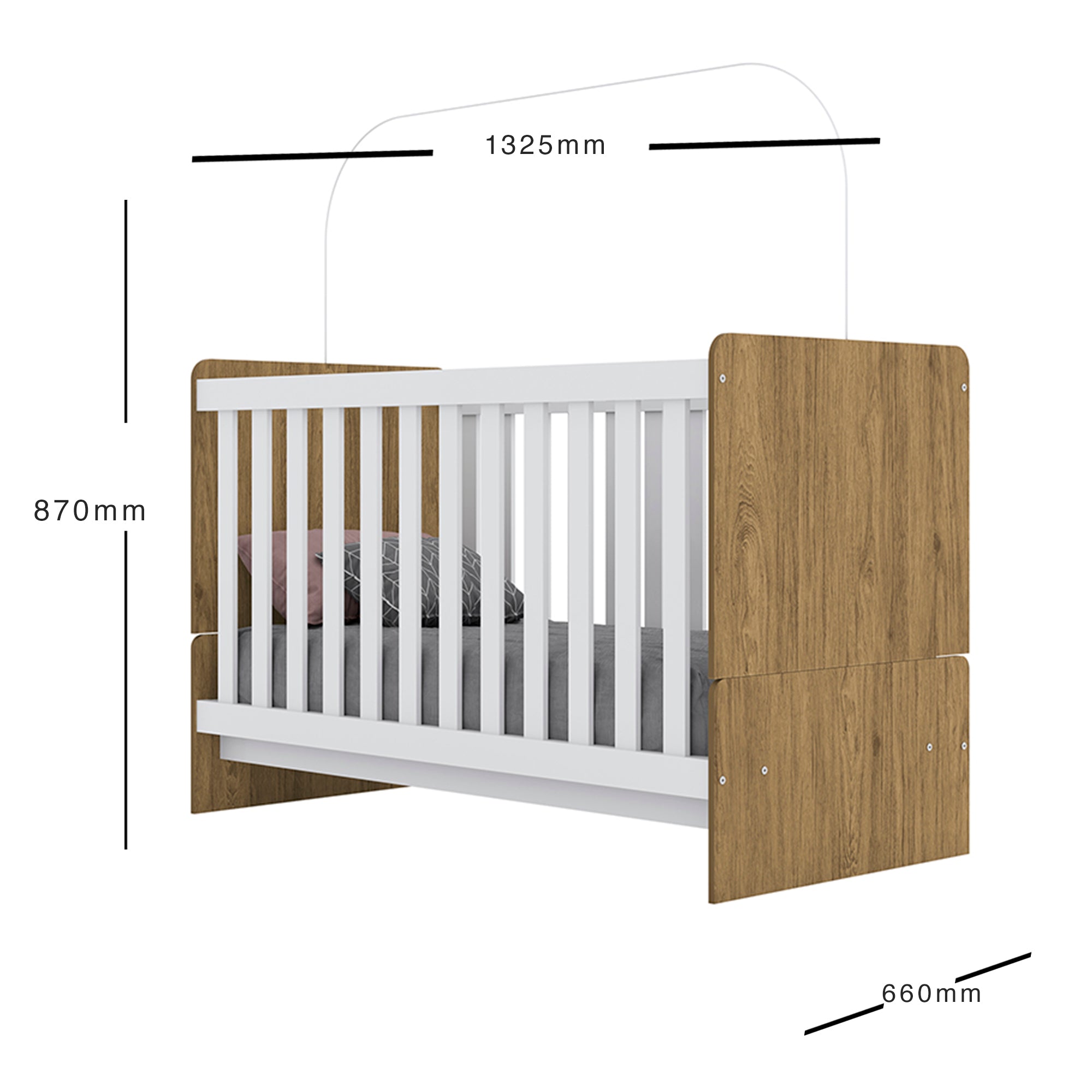 Cuna convertible multifuncional con tres posiciones ajustables: Posición de cuna elevada con barandas: El colchón se coloca a una altura intermedia, lo que facilita el acceso al bebé para los padres. Las barandas protectoras rodean la cuna, asegurando la seguridad del bebé mientras duerme. Posición de cuna baja con barandas: El colchón se ajusta a una posición más baja, ideal cuando el bebé empieza a moverse más y necesita mayor seguridad. Las barandas siguen protegiendo al niño, evitando que pueda salir accidentalmente. Posición de mini cama sin barandas: Para acompañar al niño en su transición de cuna a cama, las barandas se pueden retirar completamente, transformando la cuna en una pequeña cama adecuada para niños de hasta 5 o 6 años. Esta opción permite al niño subir y bajar de la cama por sí solo, fomentando su independencia mientras sigue utilizando el mismo mueble. Características:Cuna BICOLOR2 posiciones (Cuna con dos alturas y mini cama)NO INCLUYE COLCHONApto para colchón 130×60Opción de montajes : 2Foto referencial no incluye accesoriosImportante: Producto se entrega desarmado en caja, incluye manual de instrucciones e insumos (tornillos, tarugos, manual de armado, etc.)