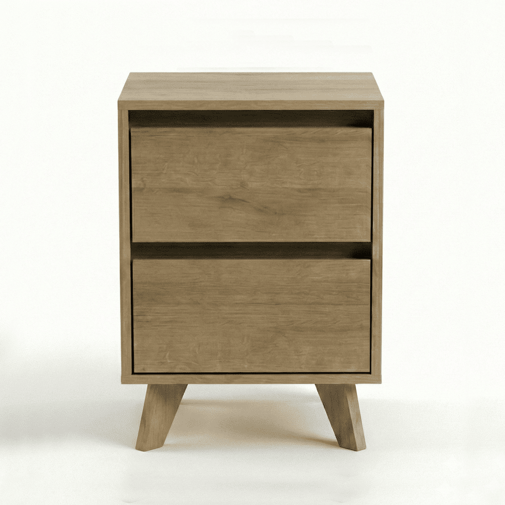 Velador en color roble natural con dos cajones. Estructura de líneas limpias con patas de madera maciza en ángulo que facilitan la limpieza y aportan estabilidad