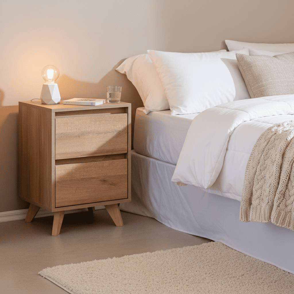 Diseño escandinavo funcional y minimalista. Este velador combina calidez natural con un almacenamiento eficiente, siendo el complemento ideal para dormitorios modernos que buscan equilibrio y simplicidad.