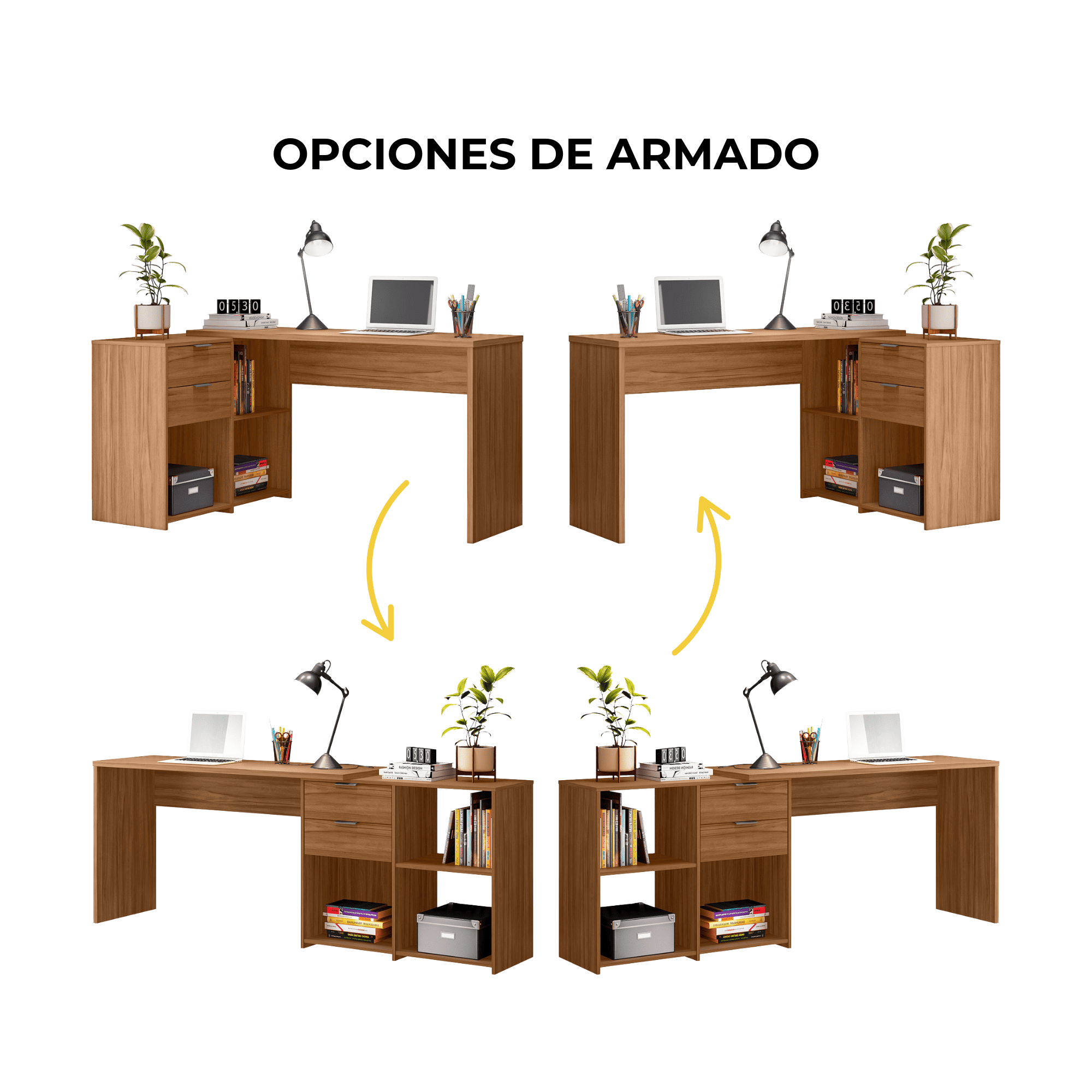 Escritorio con dos cajones de rieles metálicos, espacio para utilización de carpetas o documentos, manillas polipropileno, opciones de armado: los cajones se pueden colocar en el lado derecho o izquierdo de los espacios superiores, escritorio en L, escritorio recto.