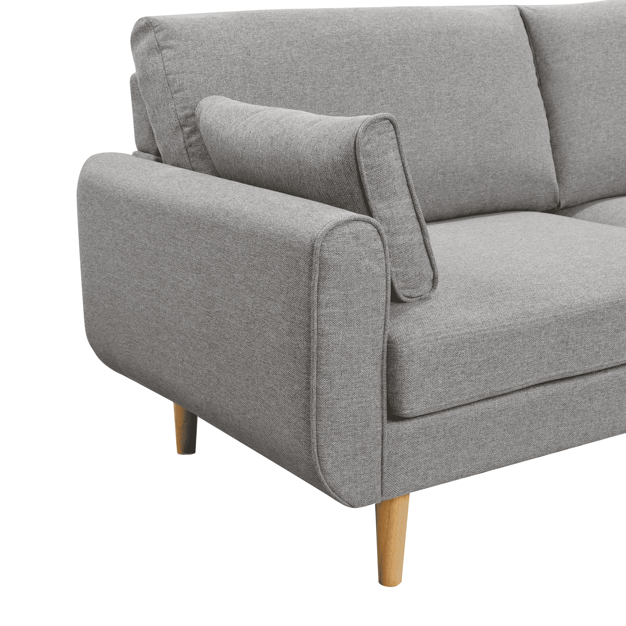 Sofá de 3 cuerpos tapizado en polyester y patas en tono madera natural. Su estructura de madera contrachapada y eucaliptus, junto a cojines con espuma D25 y resortes, ofrecen soporte y comodidad duradera.