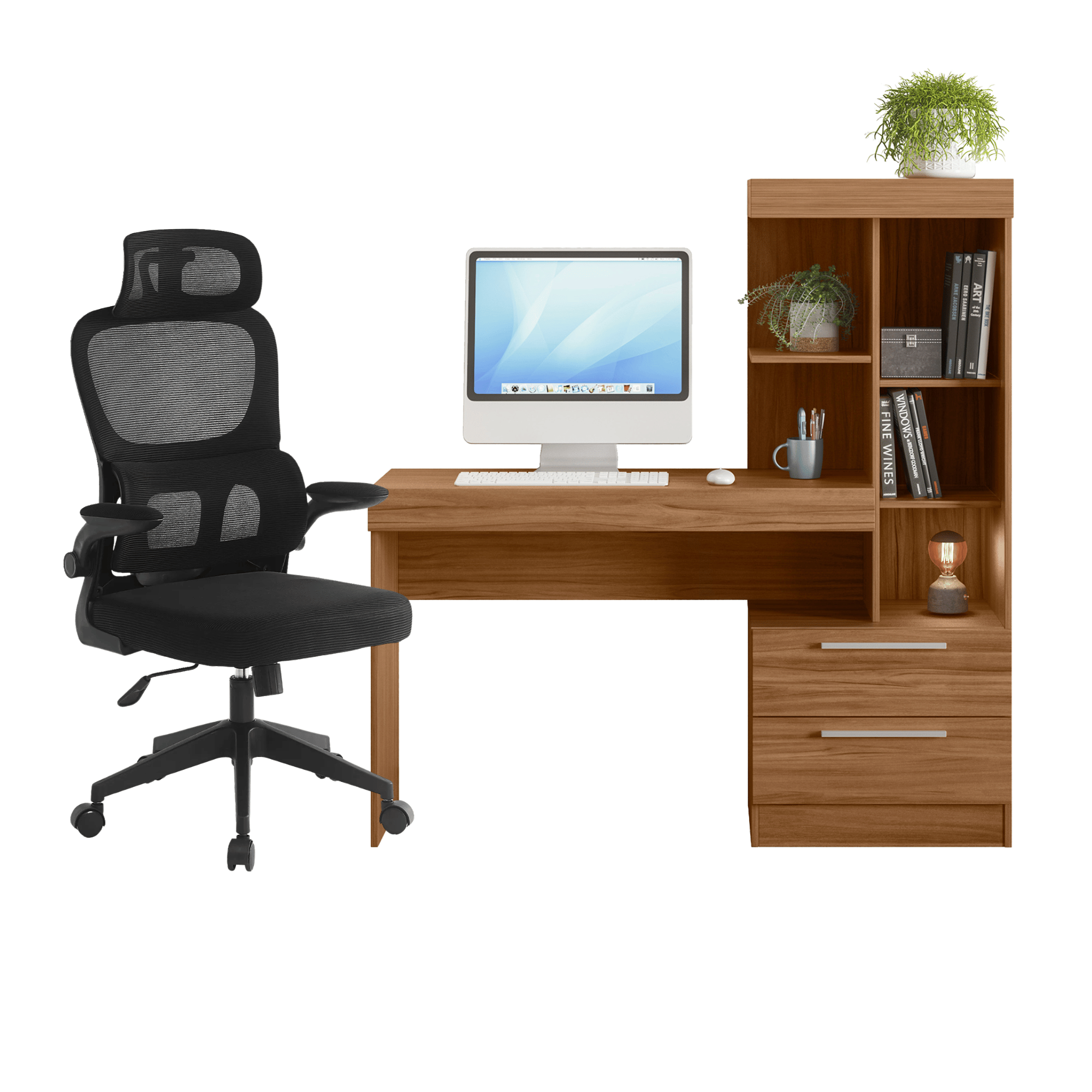 - El Escritorio Ciprés en color café fabricado en MDP de 15 mm con acabado mate, dos cajones con correderas metálicas y tiradores de aluminio, nichos laterales que facilitan la organización.