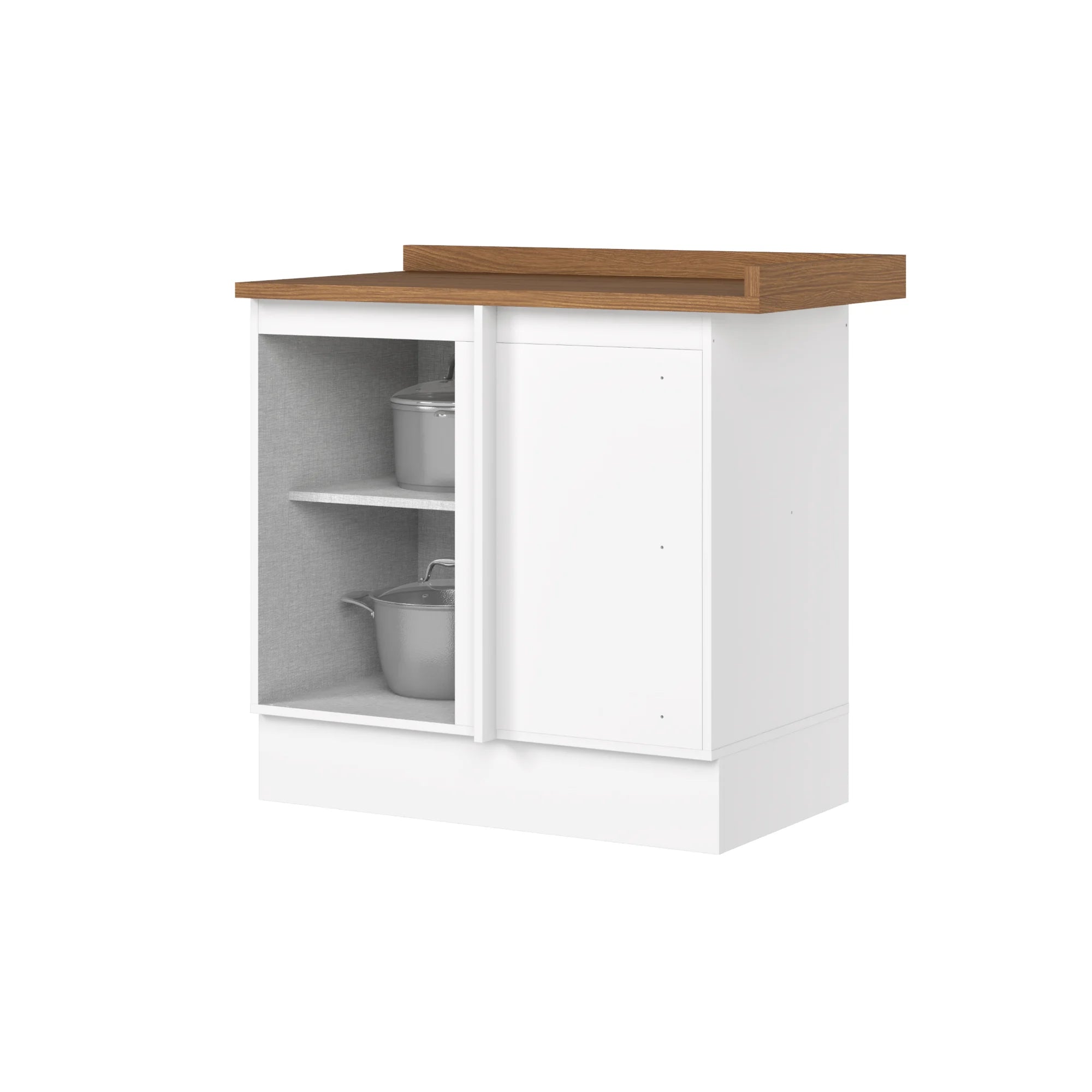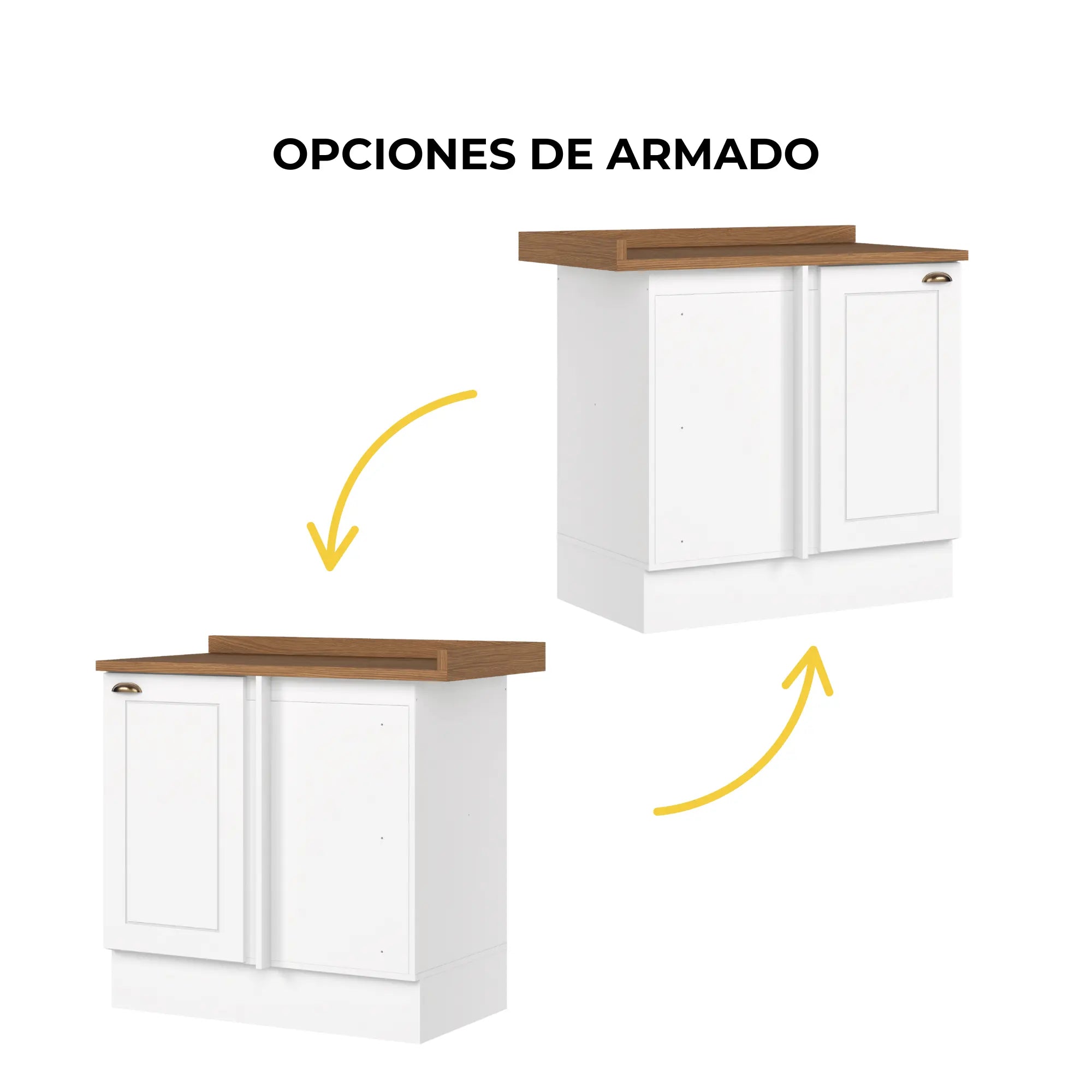 - Mueble base con cubierta, una puerta con bisagras metálicas de cierre suave, manillas metálicas, cubierta color natural, opciones de armado al lado izquierdo o derecho.