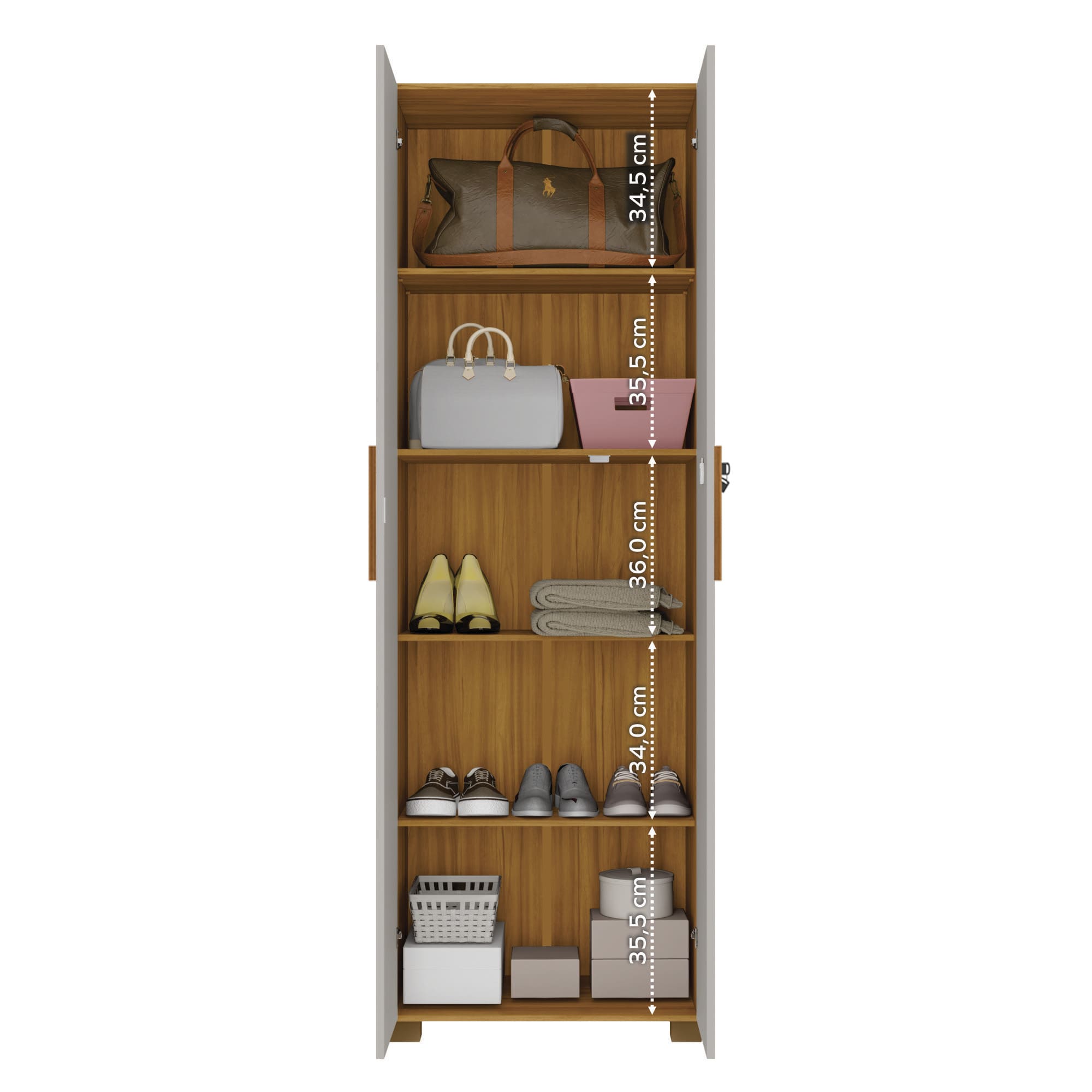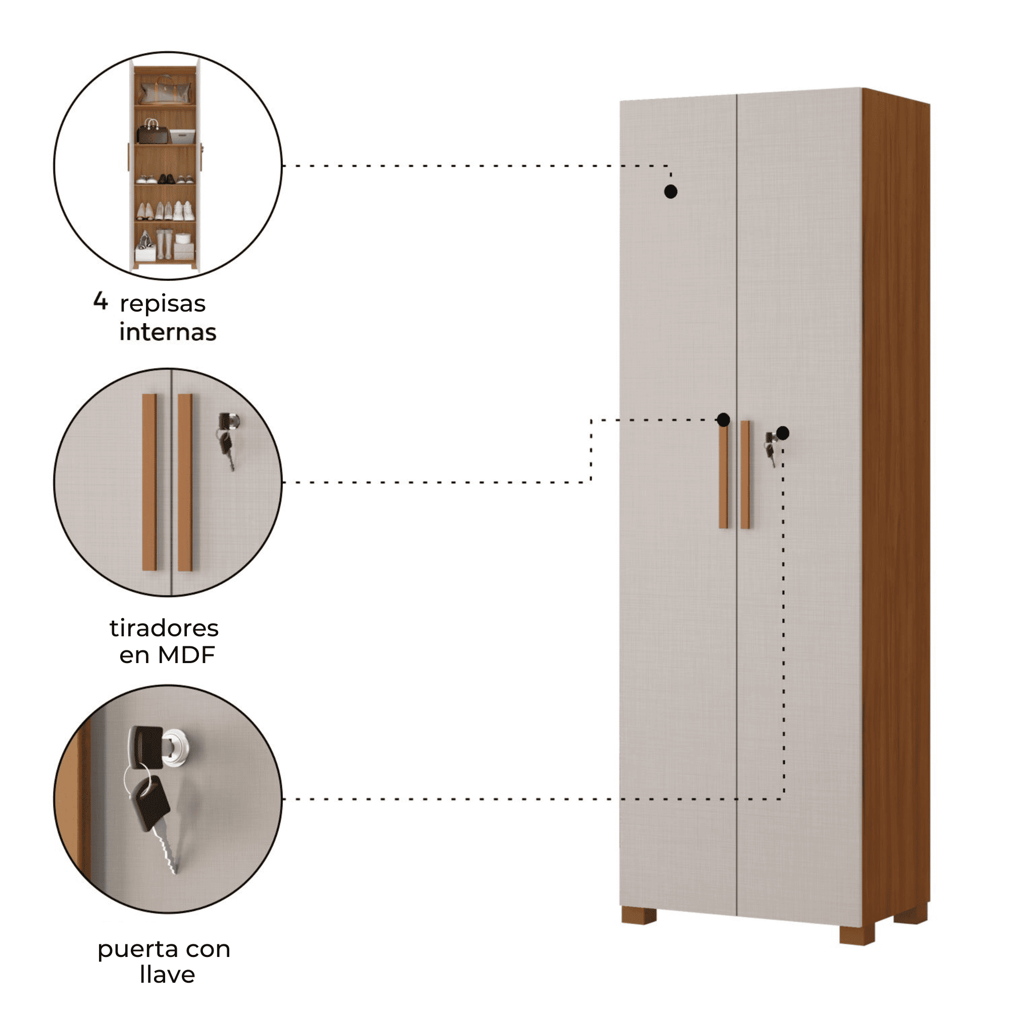 Mueble para organización multiuso, despensa de dos puertas con bisagras metálicas, la puerta incluye llave, repisas interiores, manillas de materialidad polipropileno.
