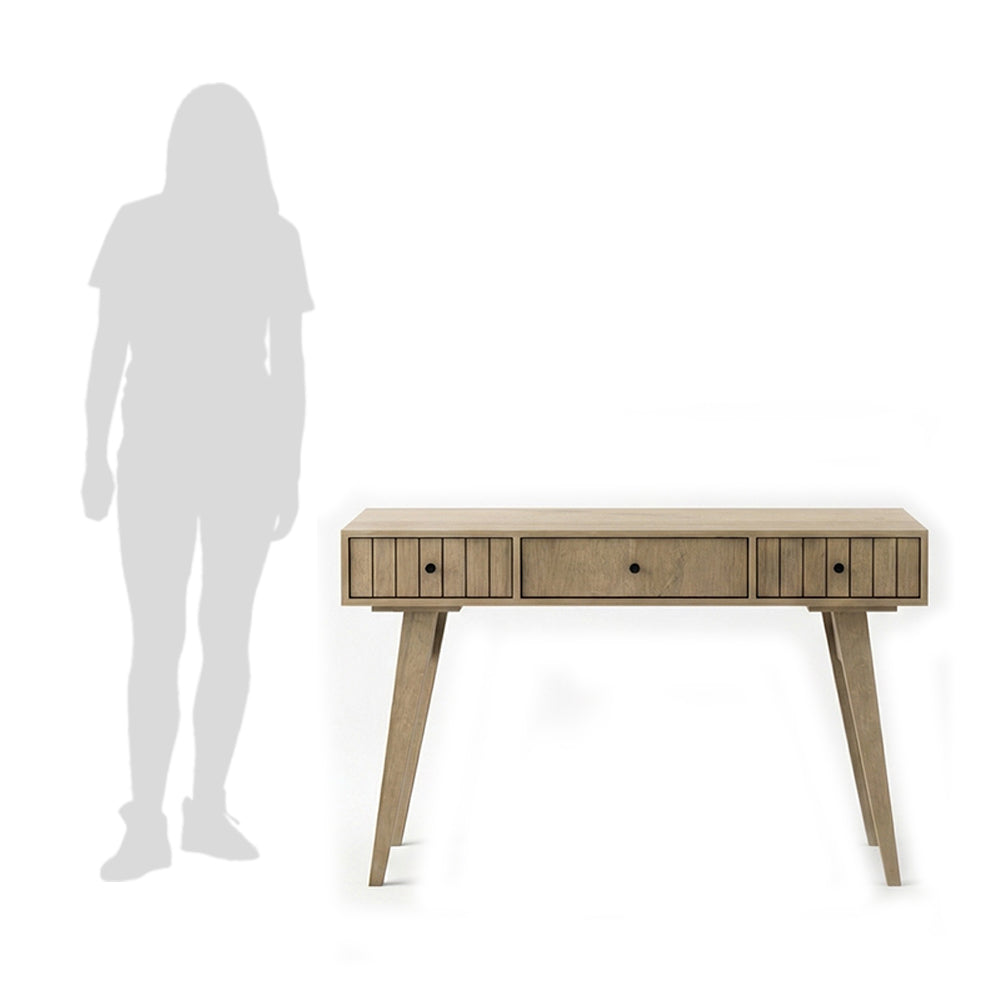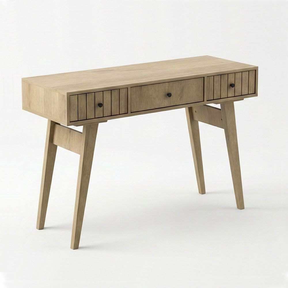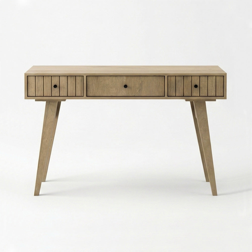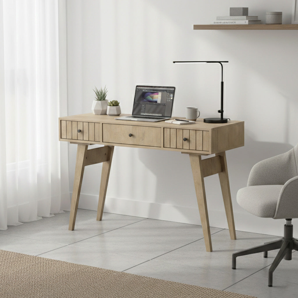Escritorio de estilo nórdico en madera natural con patas cónicas en ángulo. Posee dos cajones con frentes ranurados, tiradores negros y un compartimento central con tapa abatible para mayor organización.